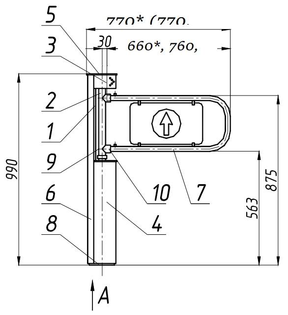 Калитка состоит из корпусной стойки 1, на которой смонтирован поворотный механизм 2. Поворотный механизм закрыт двумя съемными кожухами – верхним 3 и нижним 4, и верхней съемной крышкой 5. Кожух 4 устанавливается выдавленными пуклями в отверстия корпуса 1. Под кожухом 3 и крышкой 5 в верхней части стойки 1 находятся оптодатчики положения дуги и световые индикаторы. Индикаторы из двухцветных светодиодов (зеленый свет означает разрешение прохода, красный-запрет) по дополнительному заказу могут быть выполнены в виде отдельного корпуса и устанавливаться на кабине или стене. Кожуха 3 и 4 закрываются с двух сторон декоративными уголками 6.