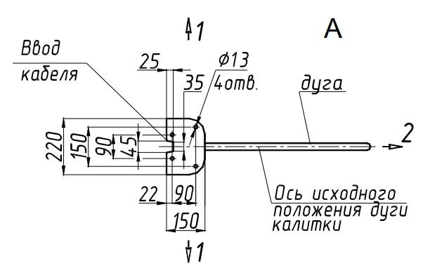 Сделайте разметку (вид А) в полу под крепежные (анкерные) болты по отверстиям основания 8, установив калитку на ее рабочее место. Подготовьте и закрепите крепежные (анкерные) болты.