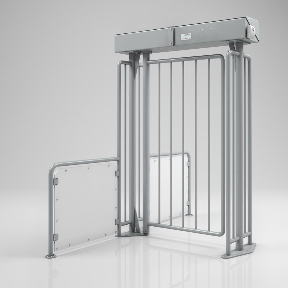 Уличная эвакуационная калитка с широким проходом для проноса или провоза багажа, для лиц с ограниченными возможностями с приводом MHTM™, шириной до 1000 мм и более, с углом открытия 90° в оба направления.
