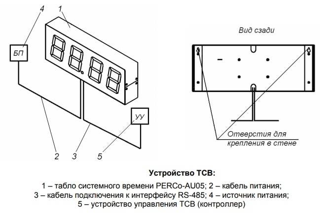 ТСВ индицирует часы и минуты. Кроме этого, на втором слева индикаторе производится посекундная индикация мигающей точкой. ТСВ может работать при управлении от любого контроллера системы PERCo-S-20, имеющего интерфейс RS-485. На ТСВ подается безопасное для человека напряжение питания не более 14 В. ТСВ имеет низкое энергопотребление не более 7 Вт. При пропадании связи с управляющим устройством ТСВ продолжает индицировать время по встроенному таймеру, при этом изменяется режим индикации мигающей точкой – с мигания раз в секунду на мигание два раза в секунду. После включения питания ТСВ индицирует «000» и находится в ожидании загрузки системного времени.