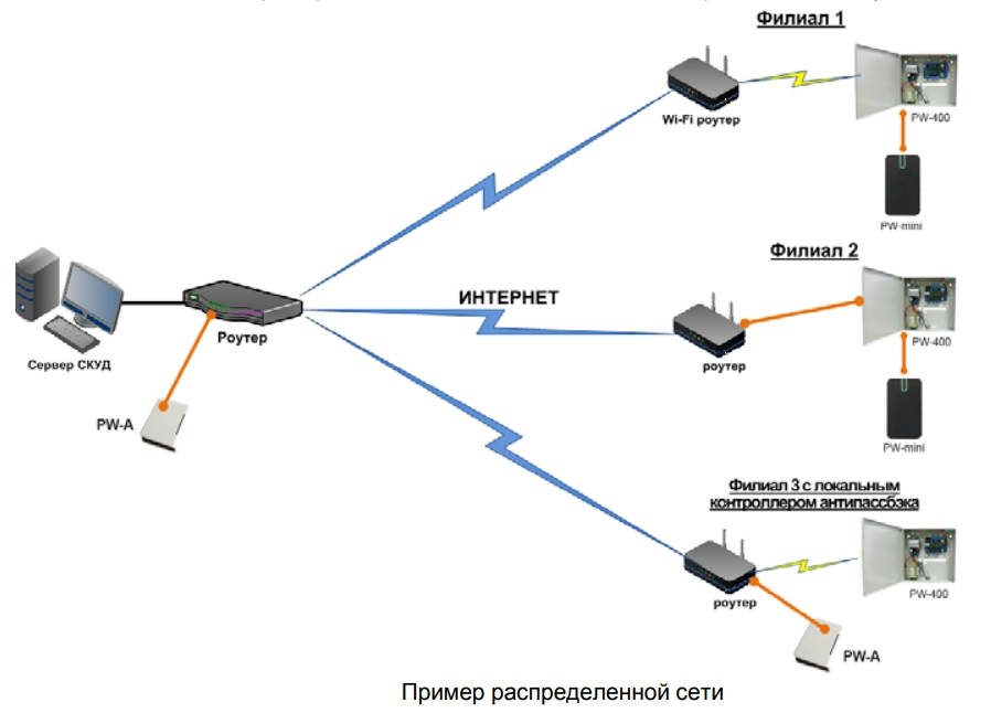 При этом обеспечивается как работа внутри локальной сети предприятия (см. рис 3), так и через сеть Интернет (см. рис. 4), что позволяет строить распределенные системы доступа любого масштаба.