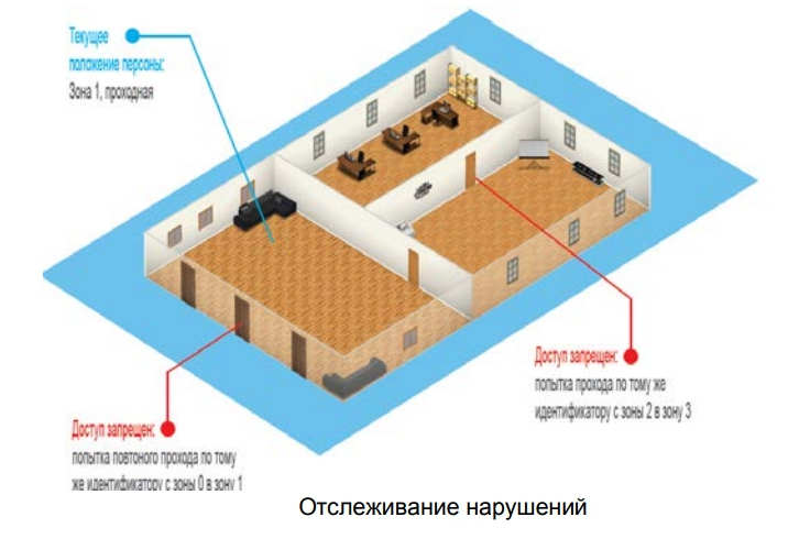 С помощью системы глобального antipassback возможно пресечение повторного прохода, использования дубликатов идентификаторов, проникновения (неожиданное появление внутри), передачи идентификатора другим лица и т.д.