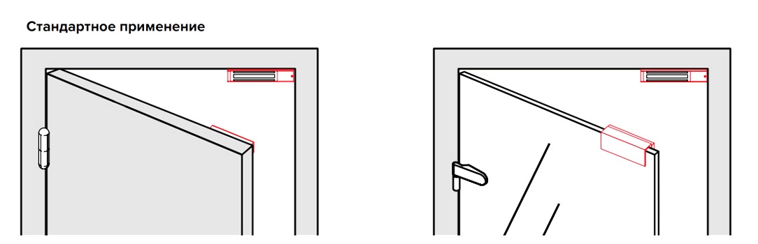 Возможна установка на сплошные, профильные и цельностеклянные двери распашного (в т. ч. маятниковые) и раздвижного типа, снаружи и внутри помещения.