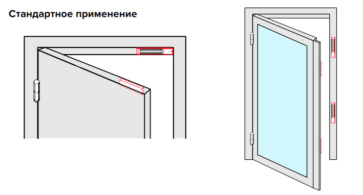 Возможна установка на сплошные, профильные и цельностеклянные двери распашного (в т. ч. маятниковые) и раздвижного типа, снаружи и внутри помещения.