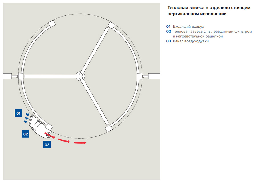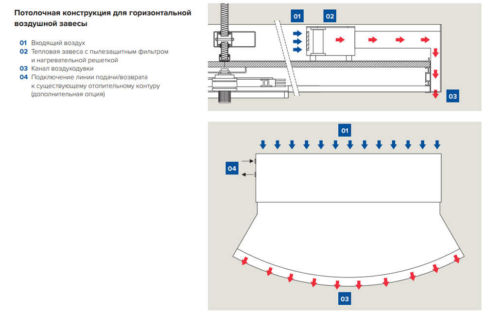 Воздушная завеса действует как воздушный барьер, который сводит к минимуму затраты на отопление и охлаждение. Она доступна в потолочном или отдельно стоящем вертикальном исполнении и располагается на внутренней части дверного проема. В качестве альтернативы стандартному оборудованию, предлагаемому с завода, может потребоваться разработка индивидуального исполнения при сотрудничестве с техническими проектировщиками и изготовителем воздушной завесы (в зависимости от индивидуального применения).