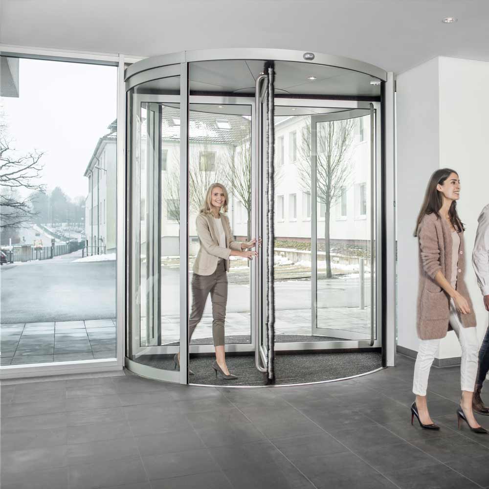 После использования карусельные двери поворачивают створку двери в исходное положение. Двойной ряд уплотнительных щеток на дверных створках улучшает микроклимат в здании даже при высоких ветровых нагрузках. Благодаря индивидуально регулируемым фасадам система гармонично вписывается в установленные конструкции здания.