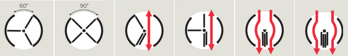 При приложении усилия больше заданного створки двери складываются в обоих направлениях. Это означает возможность быстрого выхода из здания через обе стороны двери, независимо от направления вращения.
