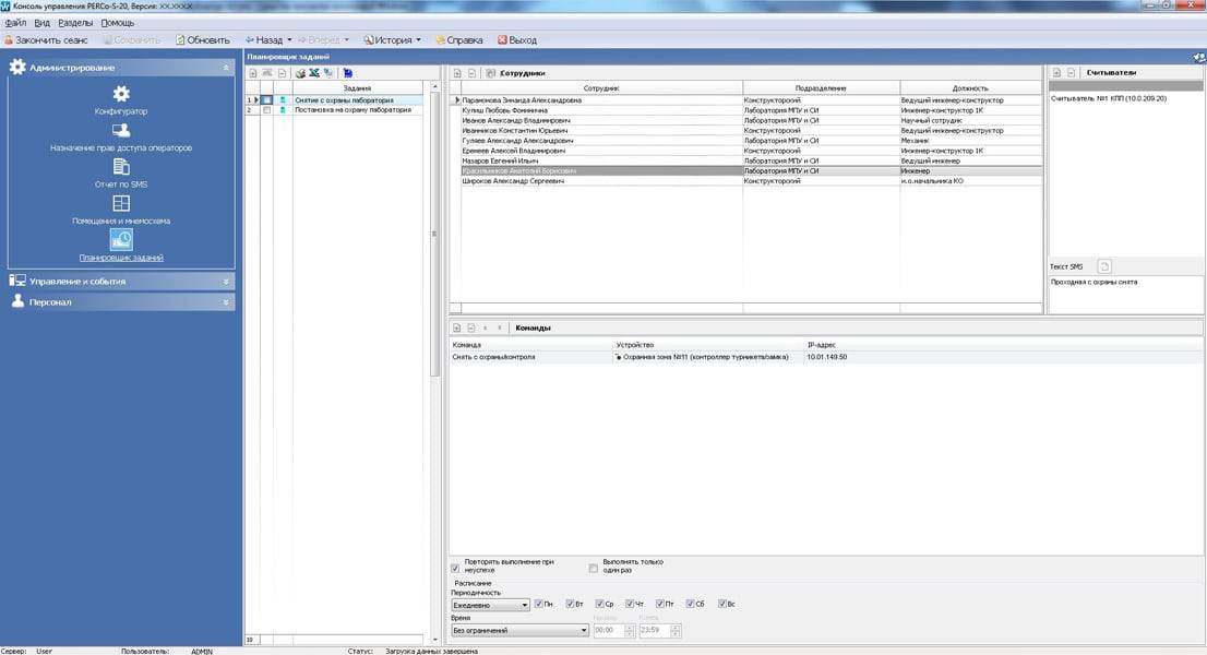 Раздел «Планировщик заданий» - задание последовательности команд управления устройствами контроля доступа, выполняемых Сервером системы, отправка SMS-сообщений и дисциплинарных отчетов по E-mail в рамках выполнения задания.