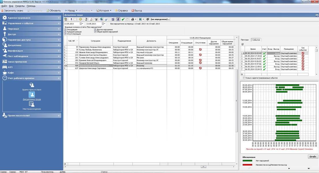 Сетевой модуль PERCo-SM05 «Дисциплинарные отчеты» комплексной системы безопасности позволяет автоматизировать формирование отчетов о времени присутствия сотрудников на рабочем месте и местонахождения сотрудников на определенный момент времени.