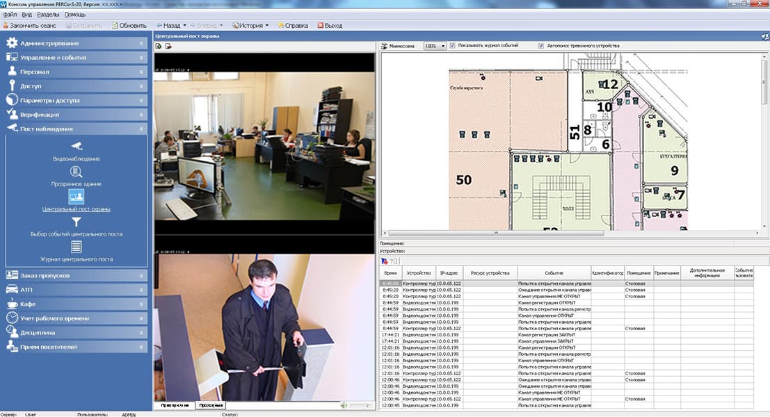 Все действия операторов, информация о фактах предъявления карт доступа, видеоинформации автоматически записываются ПО и доступны для последующего просмотра и анализа в разделе «Журнал центрального поста».
