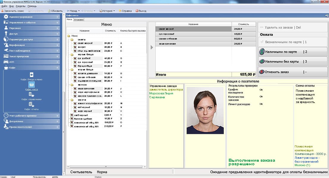 • Модуль позволит контролировать соблюдения графика посещения кафе/столовой сотрудниками предприятия.
