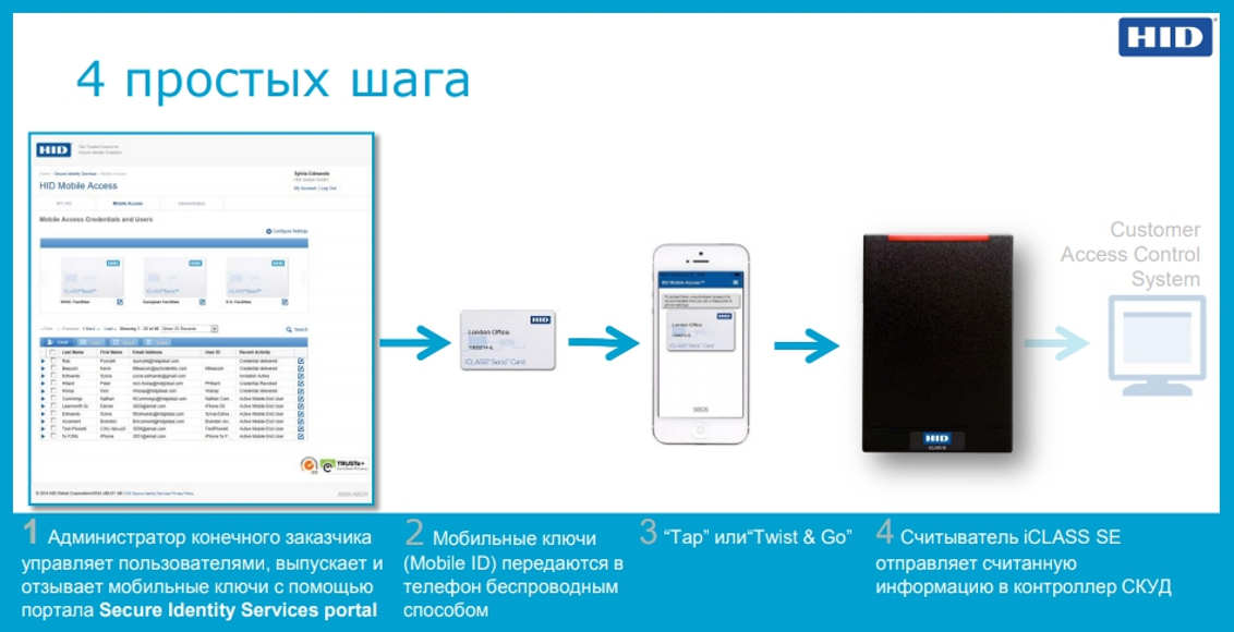 Технология санкционированного доступа в помещения при использовании мобильных устройств – это комплексное решение, объединяющее считыватели iClass SE/multiClass SE и сервисный пакет HID Global, в который входят мобильные идентификаторы, приложения для организации мобильного доступа, а также веб-сервис (специальный портал). Высоконадежный контроль доступа на базе этой технологии обеспечивают и операционные системы Android и iOS, позволяющие предоставлять или отзывать мобильные идентификаторы по каналам беспроводной связи. Для обмена информацией между смартфоном и считывателем системы контроля доступа используются решения не только на базе NFC, но и Bluetooth, обеспечивающие распознавание идентификатора на расстоянии до 2 м.