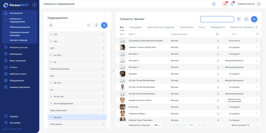 - Посетители: заявки, пропуска, временные права, печать пропусков.