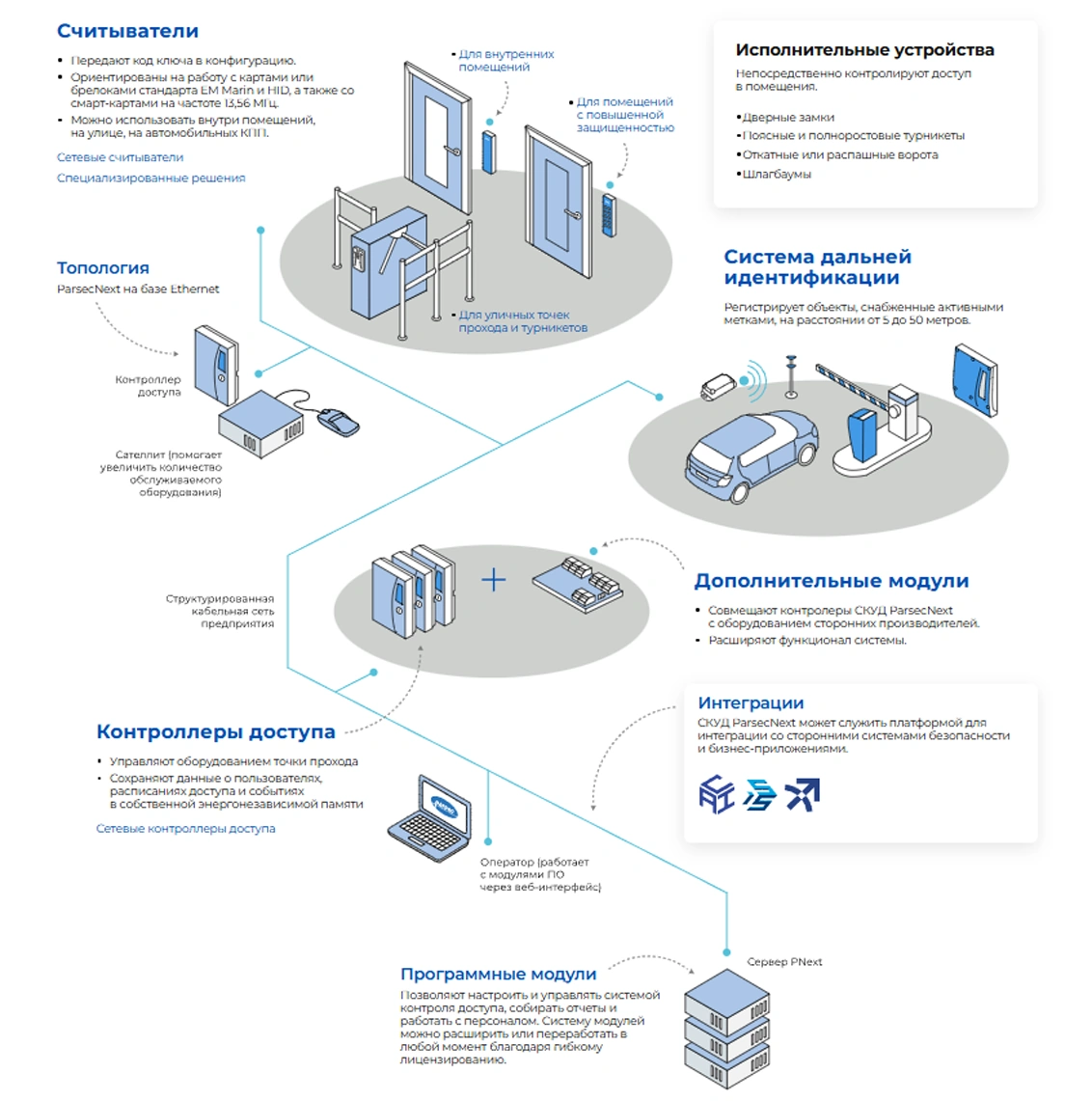 ParsecNext — программно-аппаратный комплекс (ПАК) контроля и управления доступом нового поколения для построения распределённых систем безопасности на объектах любого масштаба. Платформа объединяет сервер приложений, веб-клиент/толстый клиент, сервисы интеграции и драйверы контроллеров, поддерживает масштабирование от малого офиса до территориально-распределённых предприятий, а также работу в смешанных инфраструктурах (локально/частное облако).