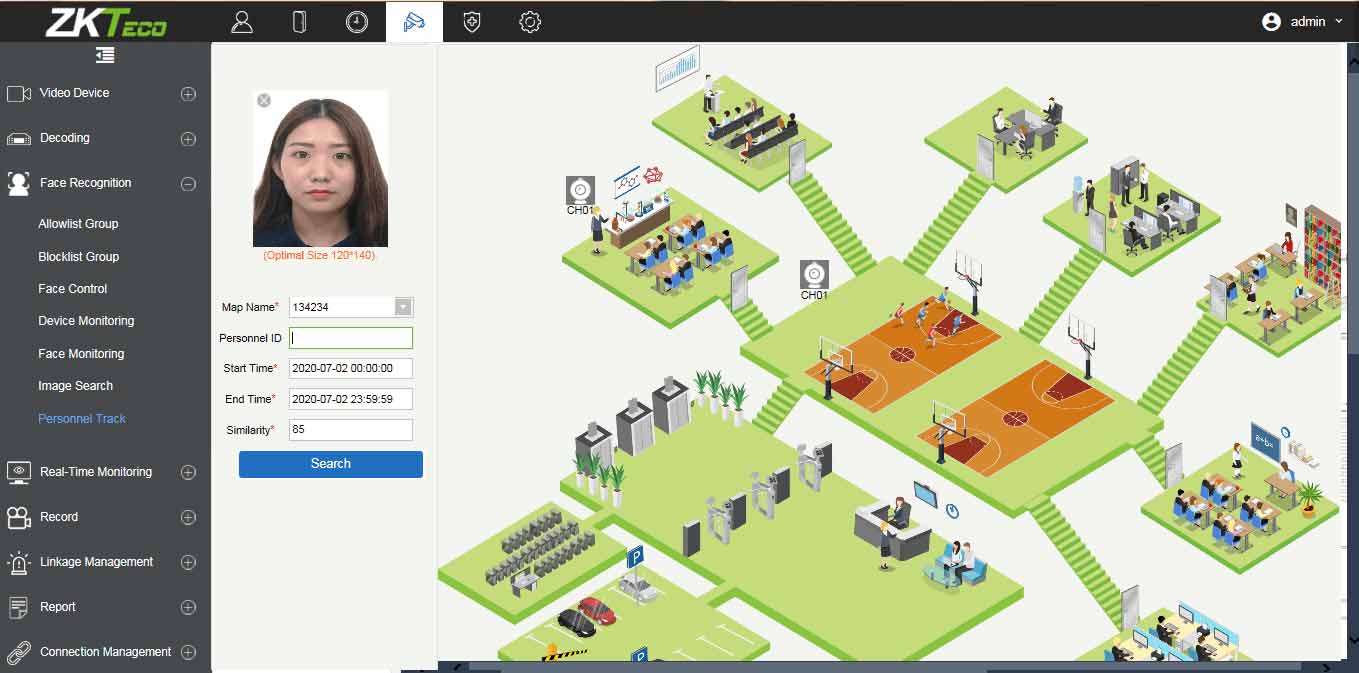 Здесь подключаем и настраиваем камеры, размещаем их на карте. Настраиваем правила видеопривязки и показа и просмотра всплывающего видео по правилам видеопривязки в реальном времени. Настраиваем и просматриваем видеозаписи в том числе по правилам видеопривязки. На основе искусственного интеллекта, обеспечивает различные функции, связанные с распознаванием лица, такие как: список разрешенных, управление списком заблокированных, поиск лица, отслеживание людей и тому подобное. Есть дополнительные настройки связей сигнализации видеоустройства и глобальных связей между видео и доступом / учетом рабочего времени.