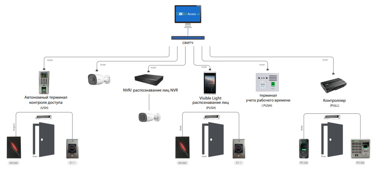 ZKBio Access IVS - это простая веб-платформа, разработанная ZKTeco, которая поддерживает большинство аппаратных средств ZKTeco. Она предоставляет обширные функциональные возможности, которые отвечают требованиям малых и средних предприятий: управление персоналом, контроль доступа, учет рабочего времени, видеонаблюдение, управление всей системой.