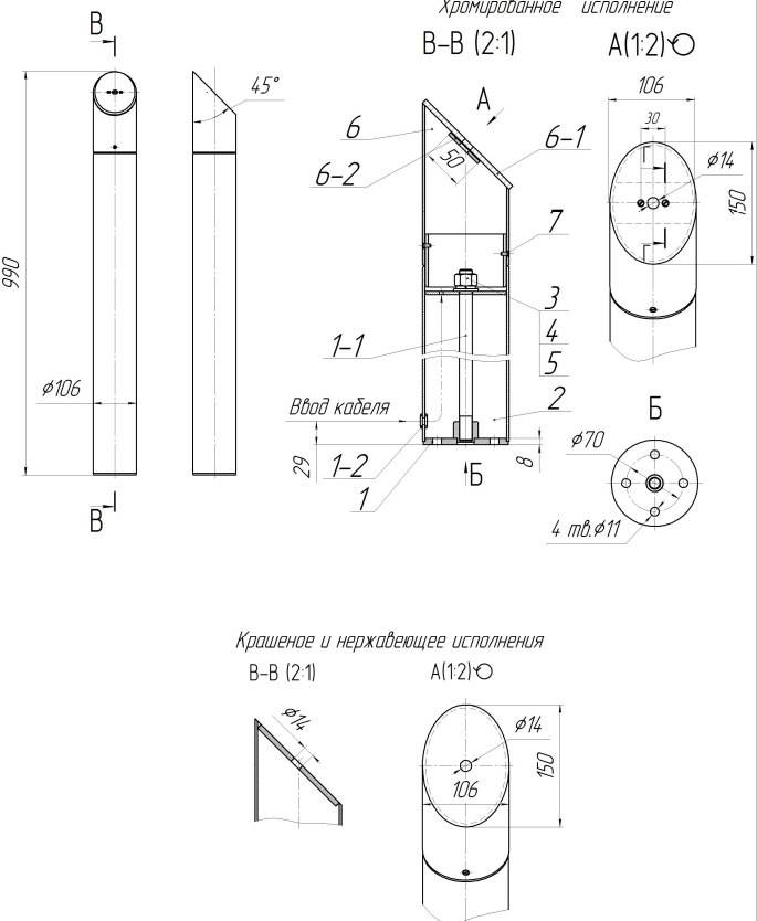 Ввод кабеля в стойку и выше к считывателю осуществляется через отверстие 1-2 в стойке и ф14 в площадке 6-1.