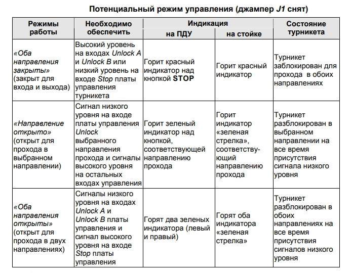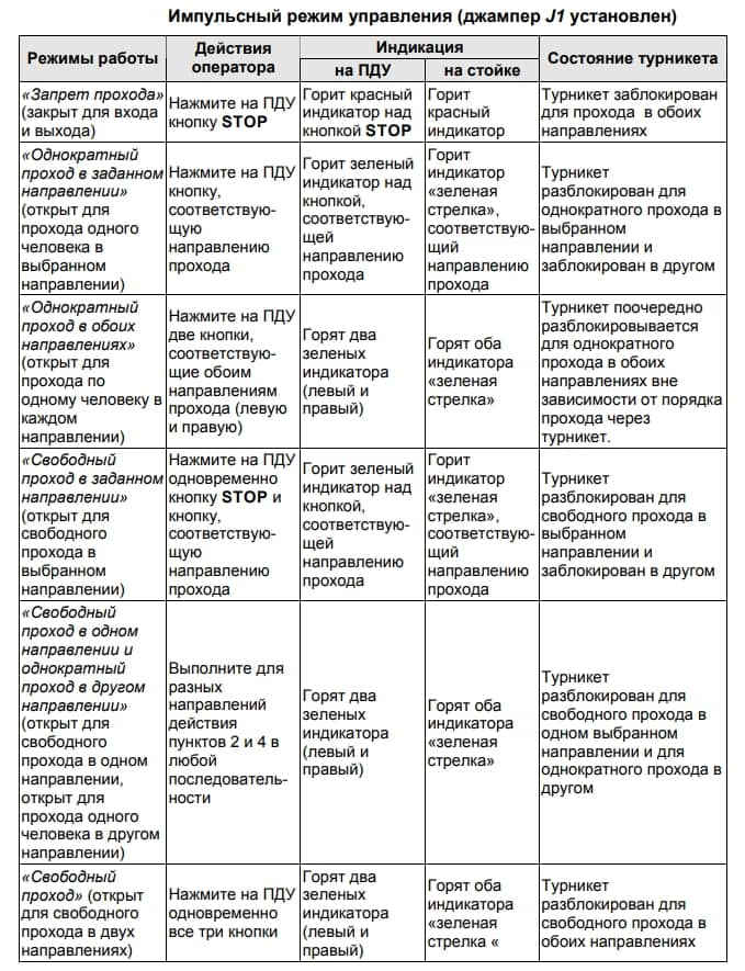 Возможны два режима управления турникетом – импульсный и потенциальный. Данные режимы управления определяют возможные режимы работы турникета.