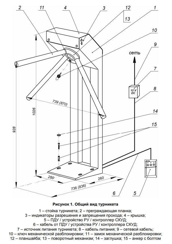 Турникет состоит из стойки турникета, комплекта преграждающих планок (2) и дополнительного оборудования, не входящего в основной комплект поставки.
