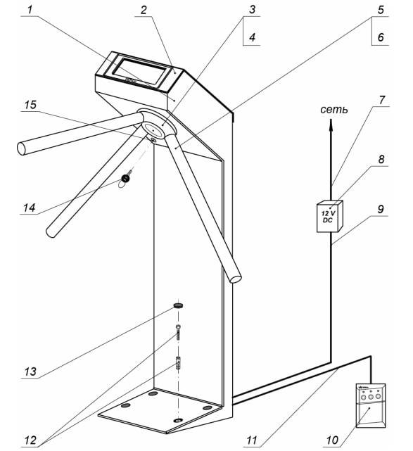 Общий вид турникета: 1 – стойка турникета; 2 – крышка с блоком индикации; 3 – планшайба; 4 – поворотный механизм; 5 – преграждающая планка; 6 – болт М8 для крепления преграждающей планки; 7 – сетевой кабель; 8 – источник питания турникета; 9 – кабель питания; 10 – пульт дистанционного управления / устройство радиоуправления / контроллер СКУД; 11 – кабель от пульта дистанционного управления / устройства радиоуправления / контроллера СКУД; 12 – анкер PFG IR 10-15; 13 – заглушка; 14 – ключ механической разблокировки; 15 – замок механической разблокировки.