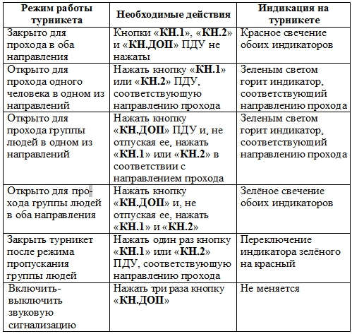 Турникет обеспечивает работу в следующих режимах: