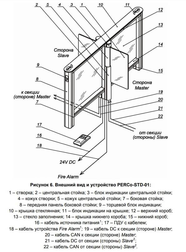 Турникет состоит из двух секций, Master и Slave, а также пульта дистанционного управления. На каждой секции установлена поворотная створка (1), приводимая в движение электроприводом. Секция Slave подключается к секции Master с помощью двух соединительных кабелей (19, 20).