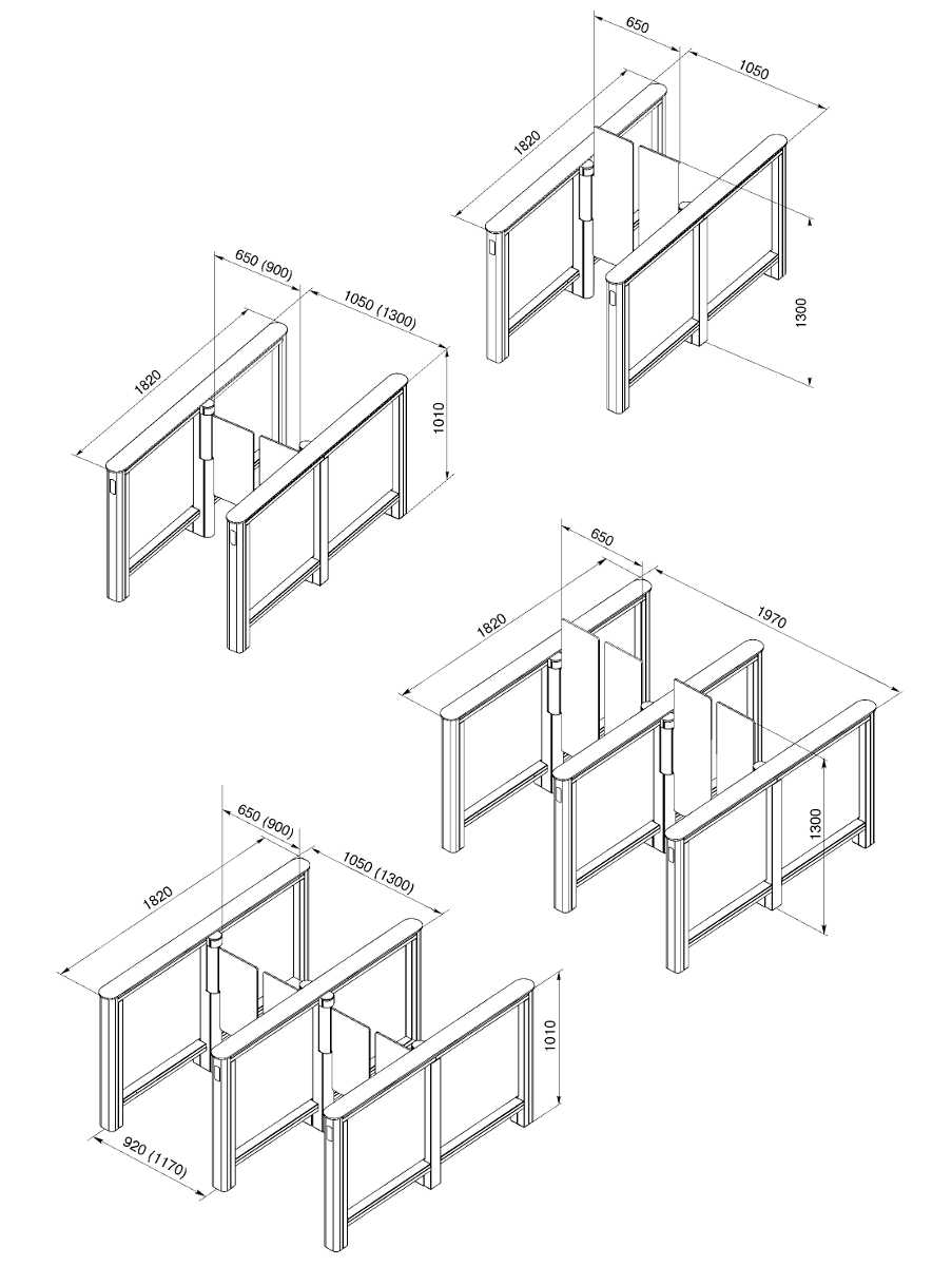 4 Габаритные размеры турникета при установке различных моделей створок показаны на рис. 1, 2, 3, 4.