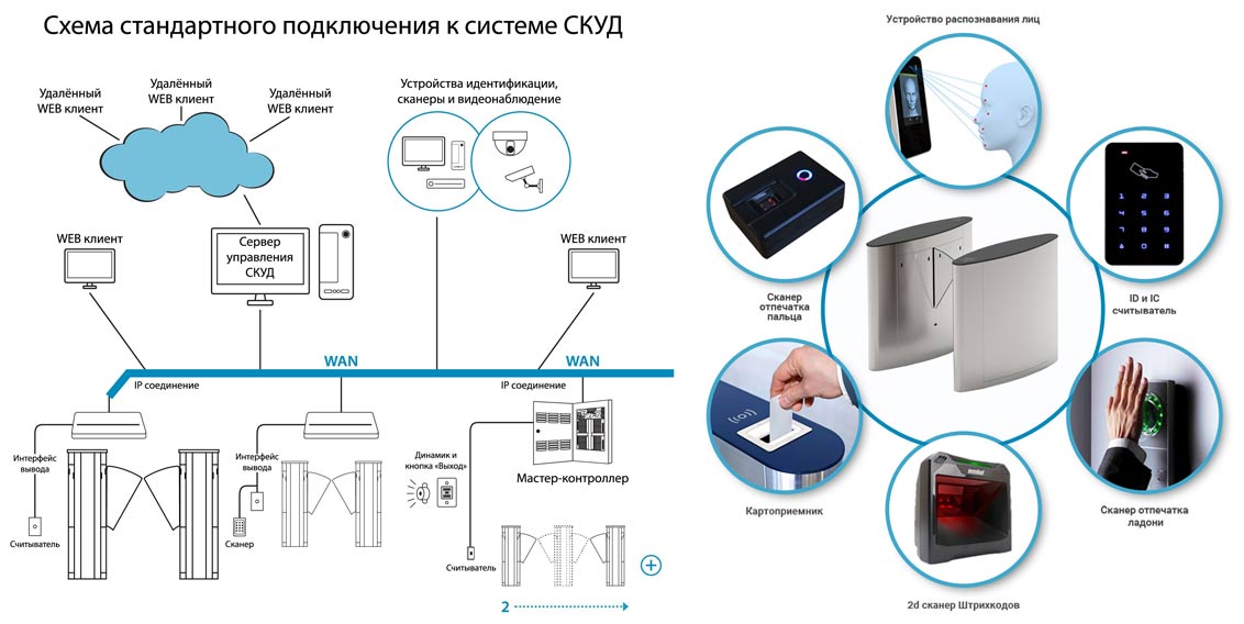 Дополнительно к исполнительному устройству можно подключить различные модули СКУД. Биометрические идентификаторы геометрии лица, отпечатка пальца или ладони, сетчатки глаза; картоприёмники; сканеры штрих-кода – всё это обеспечивает более эффективную, надежную и быструю работу проходной.