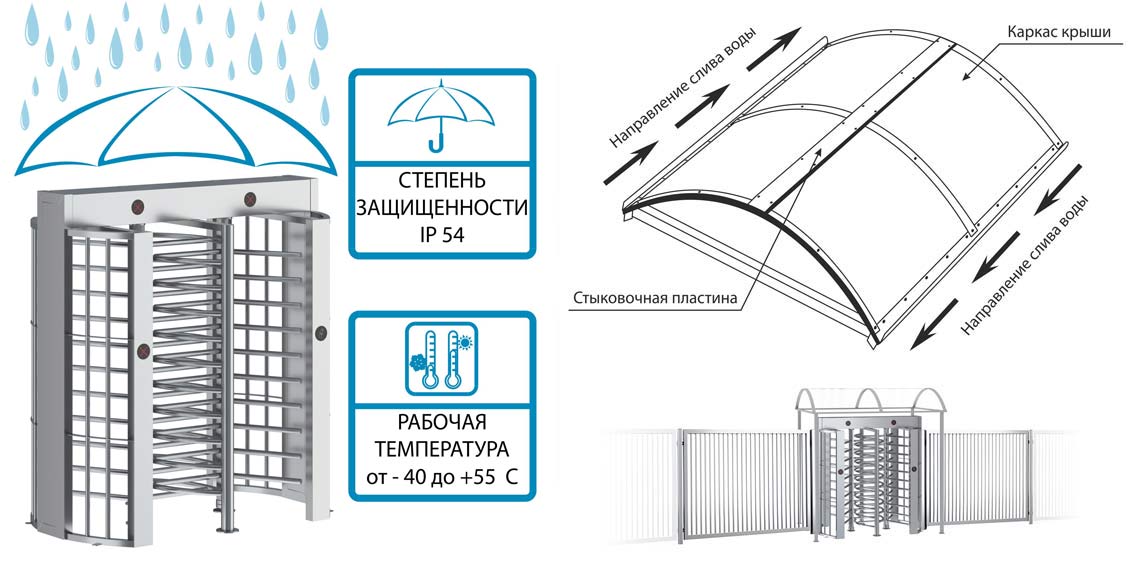 При использовании полноростового турникета СПЕКТР на открытом воздухе необходимо использовать защитный навес. Такие меры предосторожности предохраняют турникет от прямого воздействия влаги и различных атмосферных осадков, обеспечивая долгосрочную стабильную работу устройства. Эксплуатация крыши допускается при температуре окружающего воздуха от -40°С до +55°С и влажности воздуха до 90%.