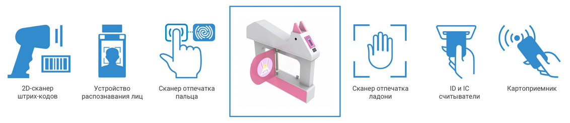Детский турникет может быть оснащен считывателем штрих-кода, картоприемником, устройством контроля времени, устройством распознавания лица, идентификаторами личности по отпечатку пальца или ладони. Возможна интеграция стороннего оборудования через сухие контакты – компьютер или металлодетектор – для одновременного контроля над пропускной системой всего оборудования с более надежным контролем доступа.