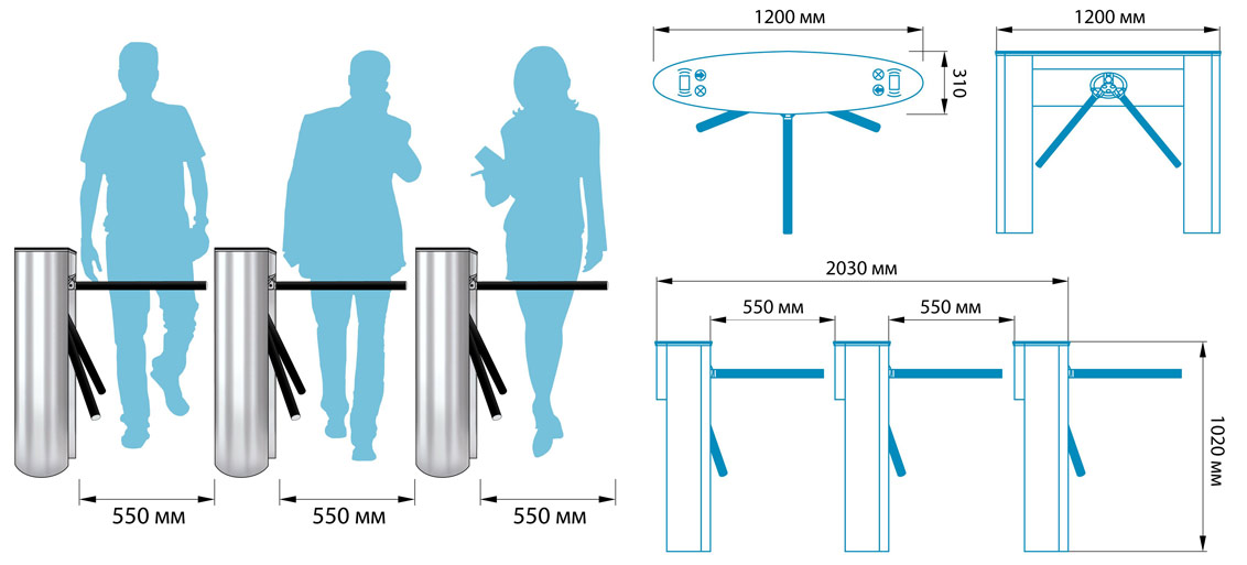 Количество турникетов, необходимое для комфортного обеспечения одиночного прохода людей рекомендуется определять исходя из пропускной способности турникета. Для данных моделей, ориентировочно, в течении 20 минут, из расчета 500 человек на один турникет.