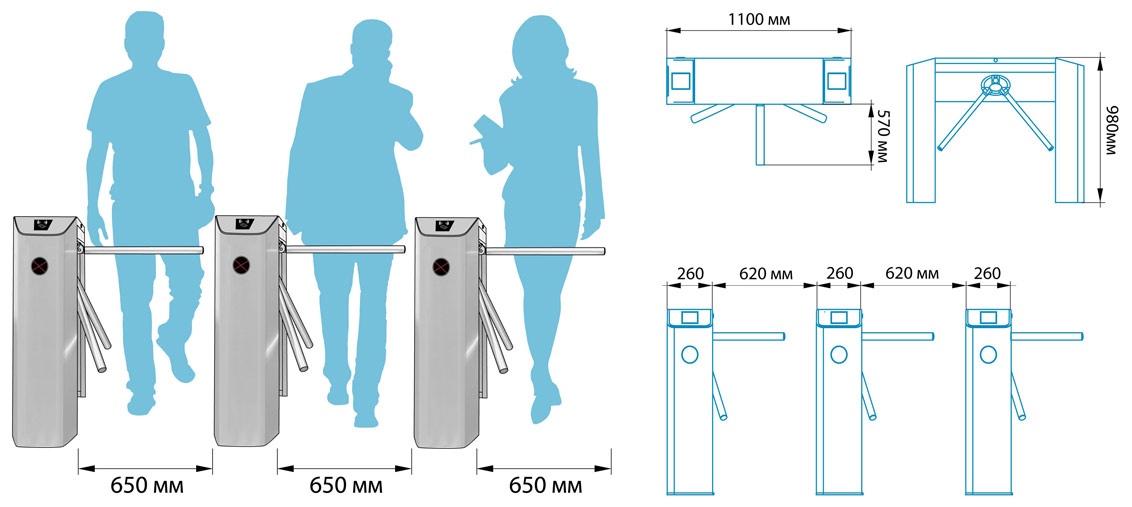 Количество турникетов, необходимое для комфортного обеспечения одиночного прохода людей рекомендуется определять исходя из пропускной способности турникета. Для данных моделей, ориентировочно, в течении 20 минут, из расчета 500 человек на один турникет.