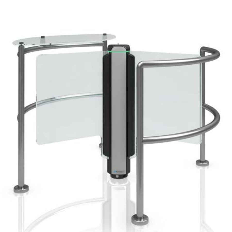 FlowMotion® mTwing моторизированный полуростровой роторный турникет для стеклянных створок (створки поставляются отдельно), доступно более 20 цветовых оттенков, низкая сила при ударе, разблокировка при отключения питания, материал тумбы - алюминий, 100% интенсивность работы, возможна установка подсветки пола и тумбы, высота 1034 мм.