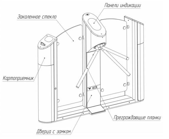 Корпус турникета и преграждающие планки выполнены из шлифованной нержавеющей стали. Элементы ограждения выполнены из закаленного стекла. Конструкция турникета имеет в своем составе интегрированный картоприемник. В средней части корпуса имеется съемная дверца с замком для быстрого доступа к кросс-плате при подключении кабелей БП, ПУ и СКУД. В нижней части корпуса имеются отверстия для ввода кабелей и крышка основания, скрывающая крепление турникета к полу.