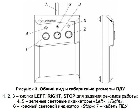 ПДУ (9) выполнен в виде небольшого настольного прибора в корпусе из ударопрочного АБС пластика и предназначен для задания и индикации режимов работы при ручном управлении турникетом. ПДУ (9) подключается к БУ (8) гибким многожильным кабелем (13) через кабельный ввод в нижней панели БУ.