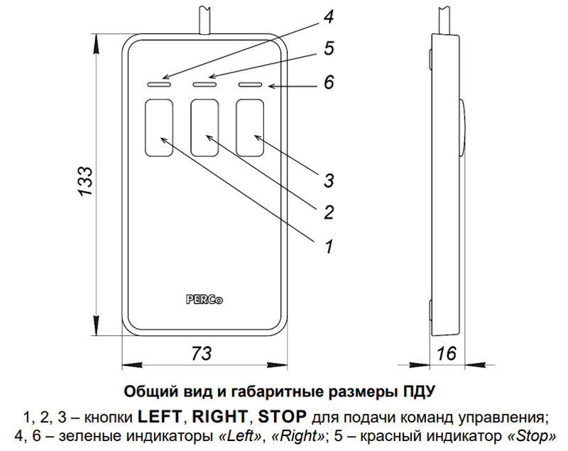 На лицевой панели ПДУ расположены три кнопки для подачи команд управления турникетом. Средняя кнопка STOP предназначена для подачи команды «Запрет прохода». Левая и правая кнопки LEFT, RIGHT предназначены для подачи команды разблокировки турникета в выбранном направлении. Над кнопками расположены светодиодные индикаторы состояния поворотного механизма турникета. Красный индикатор «Stop» указывает на то, что оба направления прохода заблокированы.