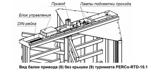 Блок управления выполнен в виде отдельного устройства в закрытом корпусе и осуществляет управление турникетом в соответствии с поступающими управляющими сигналами. Для удобства подключений все соединения блока управления выведены на DIN-рейку, расположенную внутри балки привода. Подводка всех кабелей к DIN-рейке осуществляется через нижнее отверстие в стойке с преграждающими планками (5) со стороны фланца, далее вверх по стойке в балку привода.