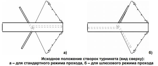 1. Проверьте, что створки турникета находятся в исходном положении, соответствующем выбранному режиму прохода.
