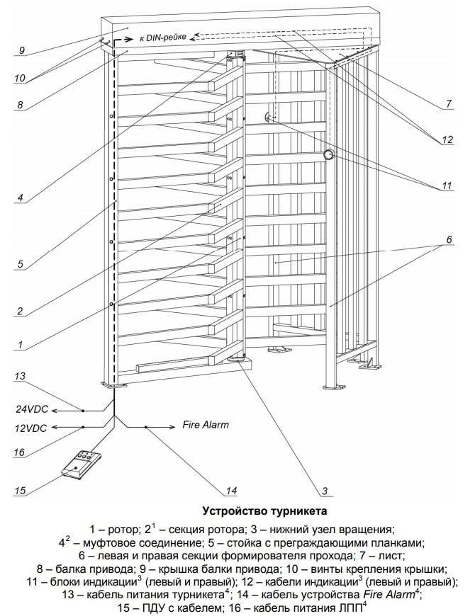 Турникет состоит из ротора (1); стойки с преграждающими планками (5); левой и правой секций формирователя прохода (6) с блоками индикации (11); листа (7); балки привода (8); ПДУ с кабелем (15); узлов, обеспечивающих работу турникета и размещенных внутри балки привода.