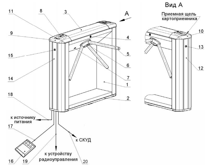 Турникет состоит из стойки (1-3) с установленной в нее платой электроники, двумя считывателями и картоприемником, трех преграждающих планок (5) и пульта дистанционного управления (16). Стойка турникета крепится к полу четырьмя анкерными болтами через отверстия в основании (2).