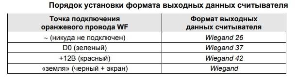Внимание! Изменения формата выходных данных Wiegand не препятствует чтению карт других форматов и выдаче считанного кода на выход считывателя. Изменение формата выходных данных интерфейса Wiegand определяется точкой подключения оранжевого провода (WF – Wiegand-Format) на выходе штатного соединительного кабеля считывателя. Выбор точки подключения производится в соответствии с таблицей.