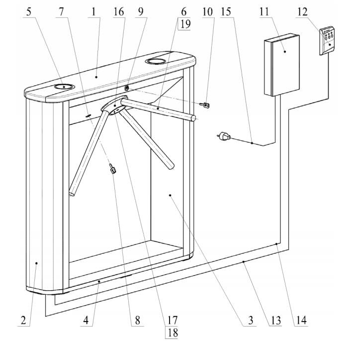 Общий вид турникета: 1 – крышка стойки турникета; 2 – стенка внешняя; 3 – каркас; 4 – основание; 5 – блок индикации; 6 – преграждающая планка; 7 – замок механической разблокировки; 8 – ключ замка механической разблокировки; 9 – замок крышки стойки турникета; 10 – ключ замка крышки стойки турникета; 11 – источник питания турникета; 12 – пульт дистанционного управления / устройство РУ /контроллер СКУД; 13 – кабель пульта дистанционного управления / устройства РУ /контроллера СКУД;14 – кабель питания; 15 – сетевой кабель; 16 – планшайба; 17 – крышка; 18 – винт М4×25; 19 – болт М8×30.