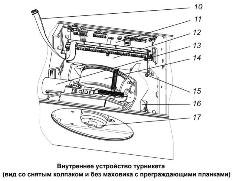 10 – кабель индикации; 11– плата управления; 12 – плата интерфейса; 13 – механизм аварийного открытия прохода; 14 – привод в сборе; 15 – точка заземления; 16 – стопорное устройство; 17 – отверстия для крепления маховика