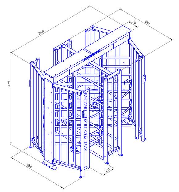Тип турникета - полноростовый шлюзовый роторный двойной четырехлопастной для прохода в двух направлениях, нормально открытый с режимом пропуска одного человека по пропуску или от пульта охранника. Для запирания турникета при отсутствии питания предусмотрена блокировка турникета с помощью ключа.