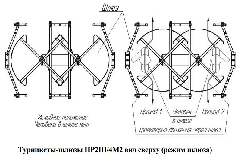 В режиме шлюза проход осуществляется в два этапа по схеме, показанной в Приложении 1.1. Сначала человек после получения первого разрешения проходит в шлюз, а затем, после получения второго разрешения, выходит из шлюза. Для того, чтобы одновременно с проходящим по пропуску человеком не мог пройти человек без пропуска используются съемные преграждающие дуги шлюза 14. Стандартно в шлюзе установлены 12 дуг 14 (см. Прил.1) – короткие дуги 14-1 в третьем и четвертом рядах снизу, а длинные дуги 14-2– в 6 ряду снизу; по желанию заказчика количество дуг 14-1 может быть увеличено.