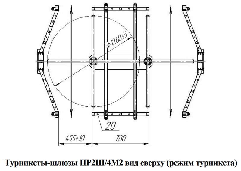В режиме турникета проход осуществляется по схеме, показанной в Приложении 1.2. Для этого нужно, во-первых, снять дуги шлюза 14 и, во-вторых, отсоединить ограничитель прохода 20 (трубу с удлинителем) от стойки бокового ограждения и установить ее на стойку лицевой решетки, для чего в турникете предусмотрены крепежные отверстия. Необходимо также открутив 4 винта крепления центральной стойки к верхнему фланцу, повернуть центральную стойку на 45° в любую сторону и снова закрепить. Таким образом можно менять режим прохода из шлюза в турникет и обратно как на одном проходе (переставляются два ограничителя прохода 20), так и на двух проходах (переставляются четыре ограничителя прохода).