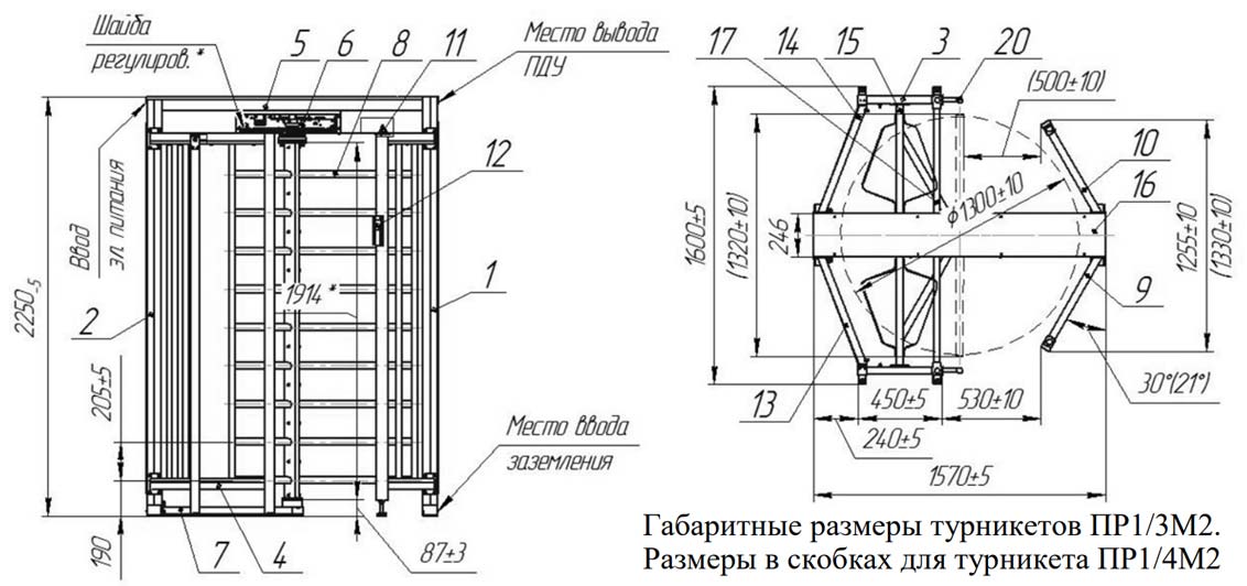 Корпус турникета необходимо заземлять. На боковом ребре внутри стойки крыла прохода секции внизу имеется основная клемма (М8) заземления; дополнительные клеммы заземления (М6) находятся на раме привода 5 , на лицевых решетках 3 и 4 и боковых ограждениях турникета.