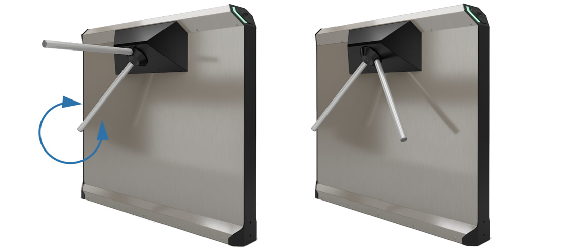 • Полноценный нормально-открытый принцип работы турникета в комплексе с планками-антипаника повышает уровень готовности к режиму эвакуации при любых типах ЧС. При отсутствии питания турникет переходит в режим антипаники, т.е. фланец с планками проворачивается, опуская планки вниз и освобождая проход.