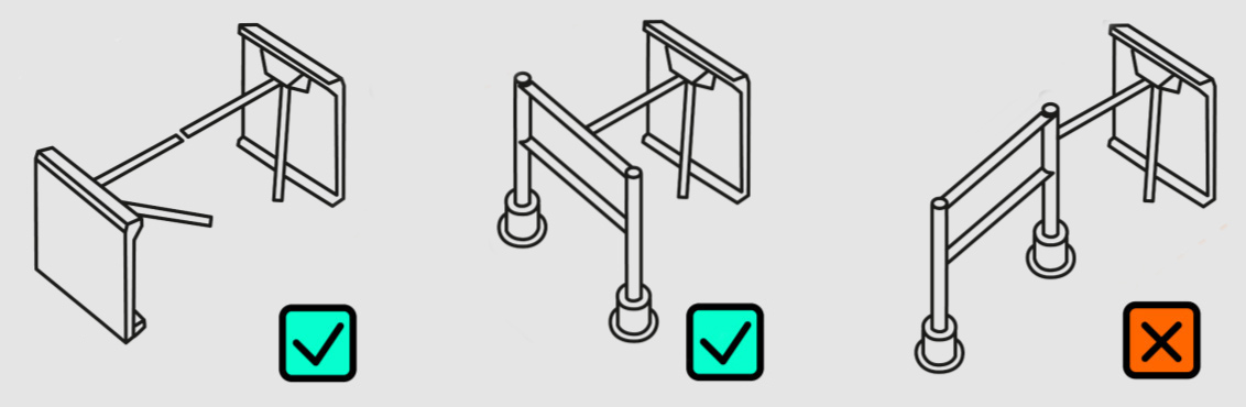 Преграждающие планки-антипаника предназначены для оперативного освобождения прохода в качестве дополнительной меры по обеспечению эвакуации, а также для проноса крупногабаритного груза. Рекомендуется кратковременная эксплуатация турникета при открытом положение преграждающих планок.