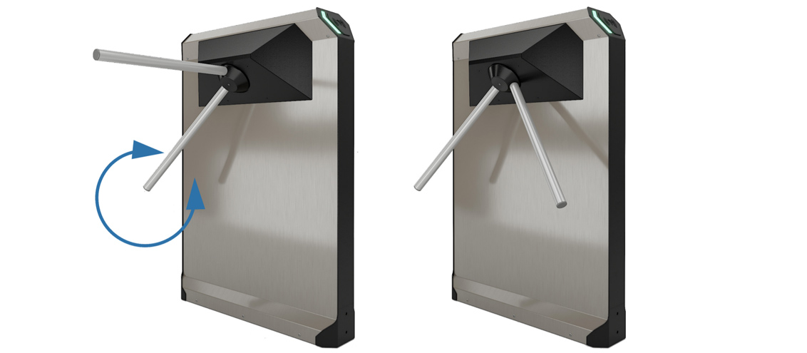 • Полноценный нормально-открытый принцип работы турникета в комплексе с планками-антипаника повышает уровень готовности к режиму эвакуации при любых типах ЧС. При отсутствии питания турникет переходит в режим антипаники, т.е. фланец с планками проворачивается, опуская планки вниз и освобождая проход.